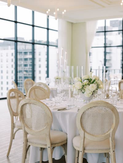 In your booking package, you have access to: On site day of venue coordinator, Harvest table for head table (up to 8 people single sided or up to 16 double-sided), round 60” tables, designer chairs, white linen napkins & table cloths, two display easels, a card box/table numbers, cake table and service of host provided cake. For further inclusions and event details, please inquire for our events package.
