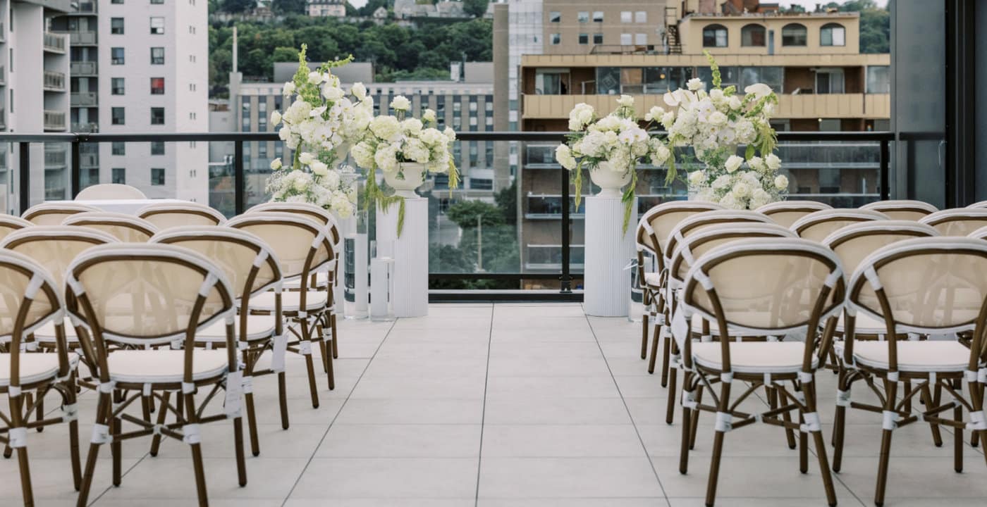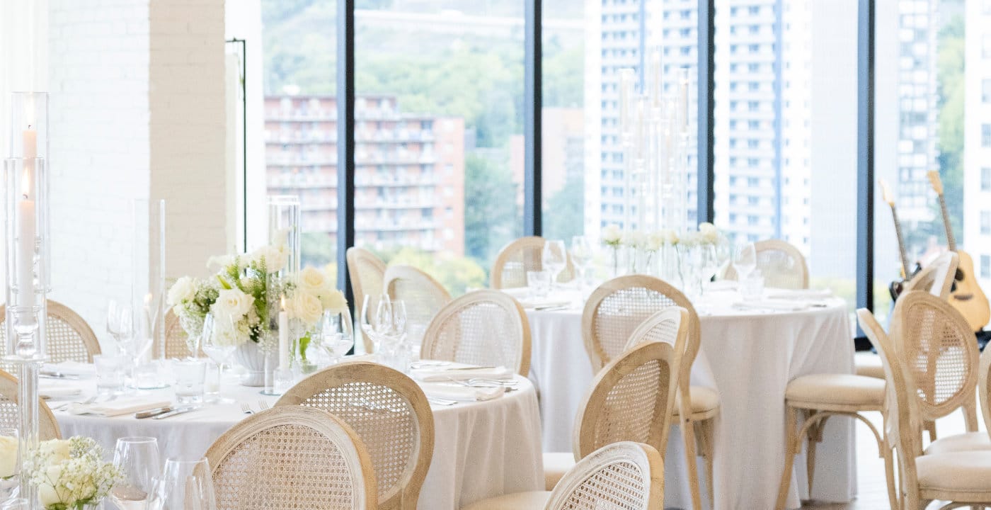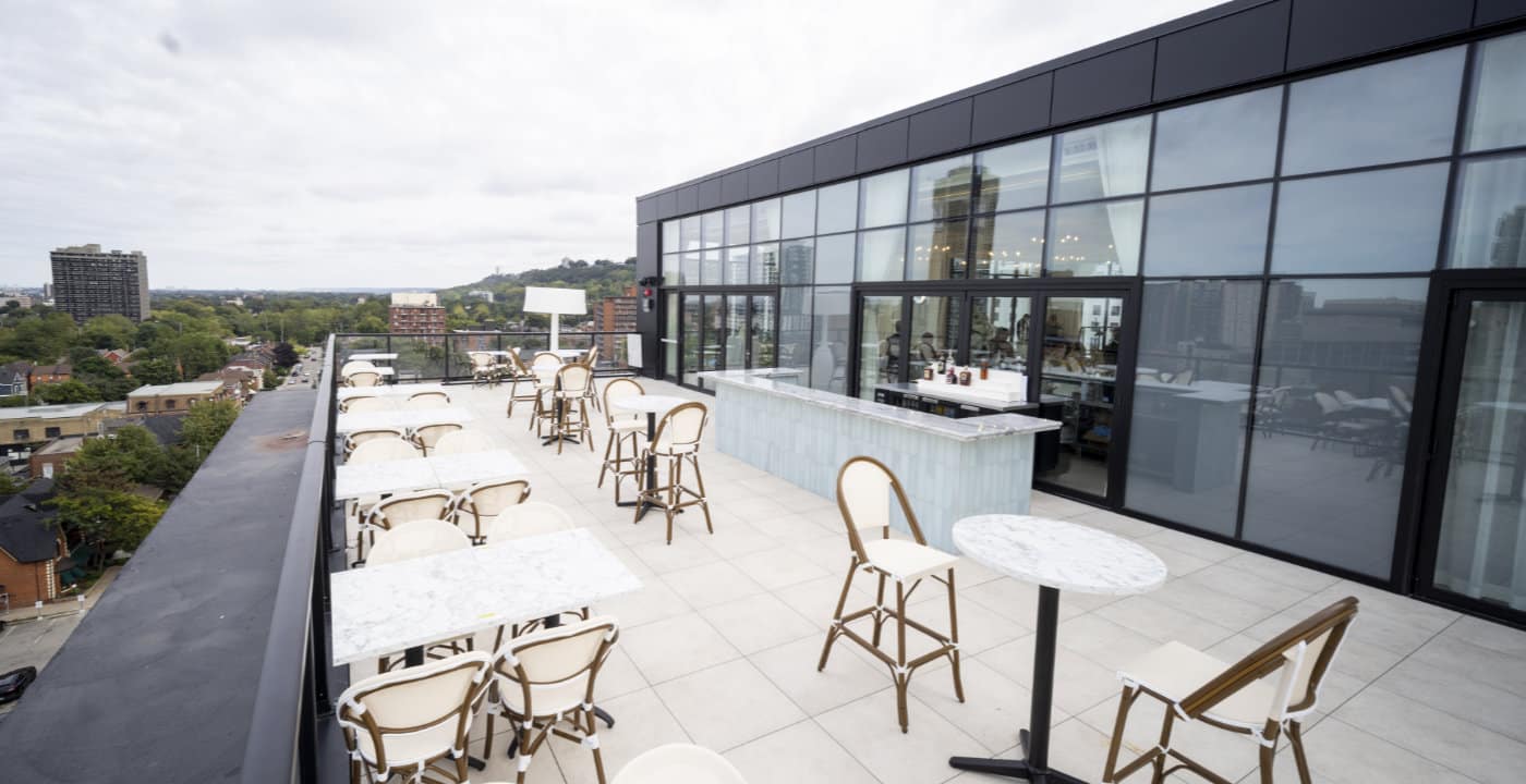 Our Penthouse offers flexible space including a double-sided bar, oversized terrace with panoramic views of the escarpment, an outdoor ceremony space, and accessible washrooms and elevators. Our indoor space comfortably seats up to 120 guests. Event booking inclusions can be found on the following slides.